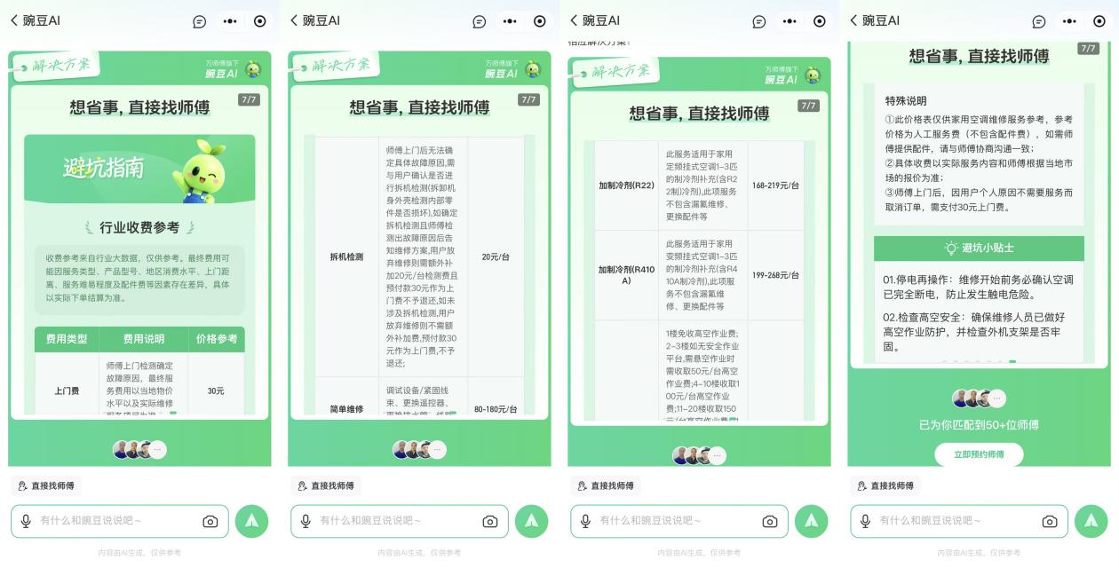 正如豌豆AI团队的愿景“用科技还原服务本真,让每一次到家服务都值得信赖”,万师傅运用大模型技术弥补行业教育的空白,充分满足消费者的知情权,打通横亘消费者与服务者之间的信息围墙,重塑信任基础;并借助AI技术排查价格、履约、技能上的盲区,增强服务确定性,从而营造透明、公平、安全的交易环境。
