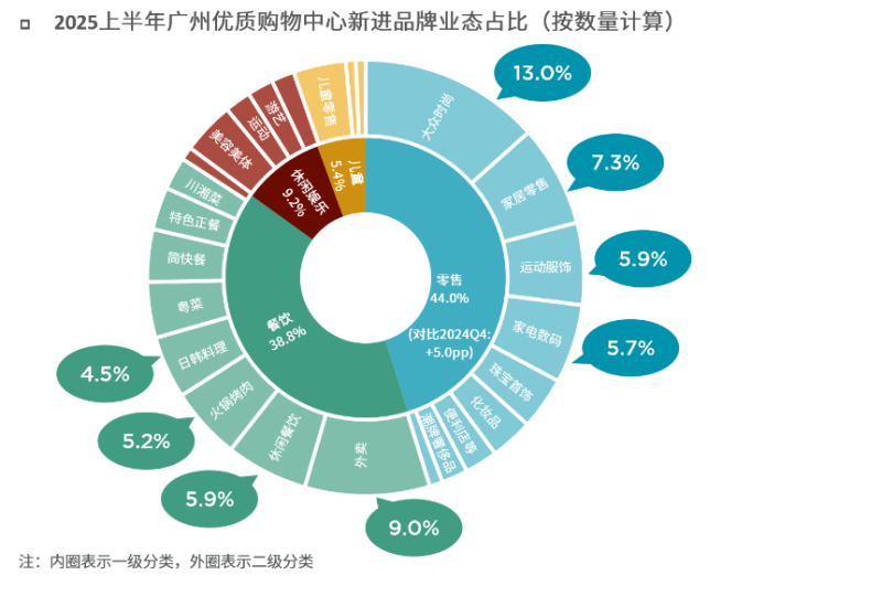 二季度,购物中心新开和待开品牌中零售类占比达45.4%,文化及休闲娱乐、户外运动和化妆品领跑。随着文化消费市场的迭代升级及消费者对于优质内容需求的激增,IP衍生经济表现强劲,1-4月,广州文体商品零售额同比增幅超30%。泡泡玛特、TOP TOY、卡游等代表性品牌加速布局;购物中心亦通过主题展览强化体验,如天环广场的泡泡玛特潮玩IP展、以及K11即将举办的哆啦A梦巡回特展。