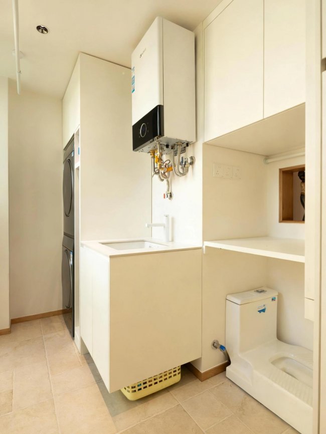 将厨房移至公共区后,原厨房区域改造为独立的洗衣家务间(在当地燃气公司允许的情况下),整合洗衣机、烘干机、水槽与收纳柜,实现洗、晒、熨、储一站式完成,大大缩短家务动线。