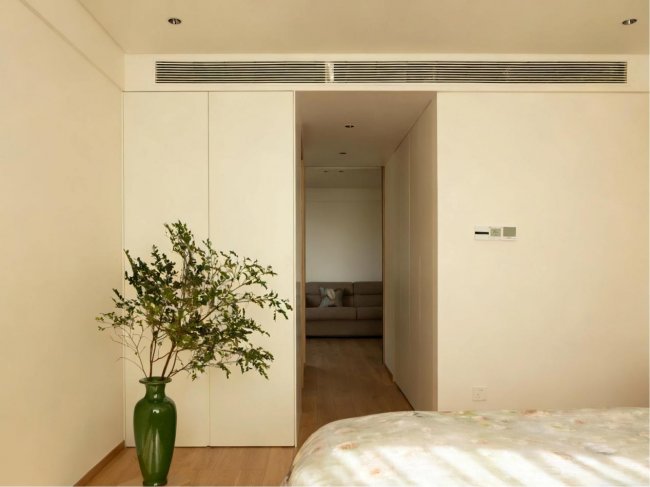 拆掉原本阻隔在入户与客厅之间的两道门,通过布局调整,形成一条串联卧室、书房、储物间、卫生间与客厅的环形动线。