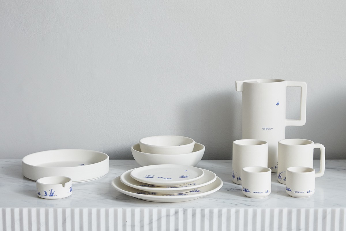 该系列的品项众多,包括大大小小的餐盘、碗、咖啡壶、咖啡杯、马克杯、玻璃杯、烟灰缸、置物盘等,而设计以矢车菊蓝为主题,并且搭配Off-White Logo字样。