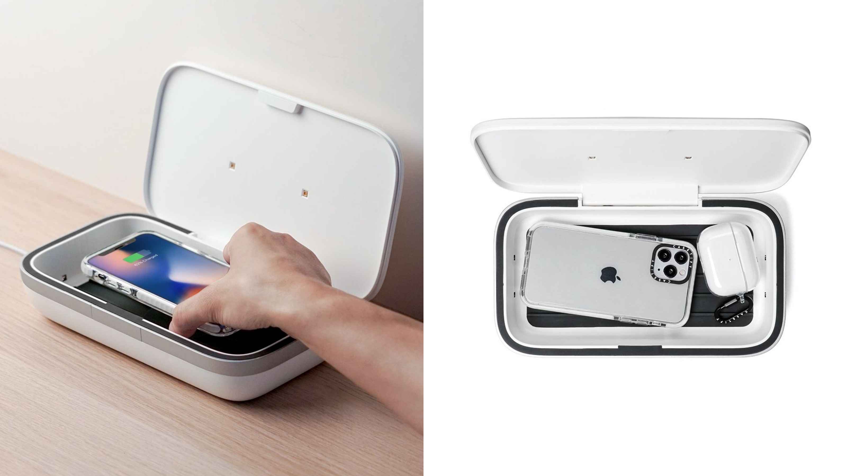 3C周边品牌CASETiFY推出的“UV手机消毒器”,利用紫外线照射可消灭99.9%的细菌,同时能替手机无线充电,手机之外也可以消毒任何随身物品,素面的外型很简约有质感,共有黑、白、以及今年推出的全新嫩粉红色选择,分为大、小尺寸,大的3分钟可完成消毒,小的则需6分钟。(目前尚未有科学研究证实采用的UV-C光可以杀灭COVID-19病毒,但UV消毒机能有效杀灭99.9%的常见家居细菌。)