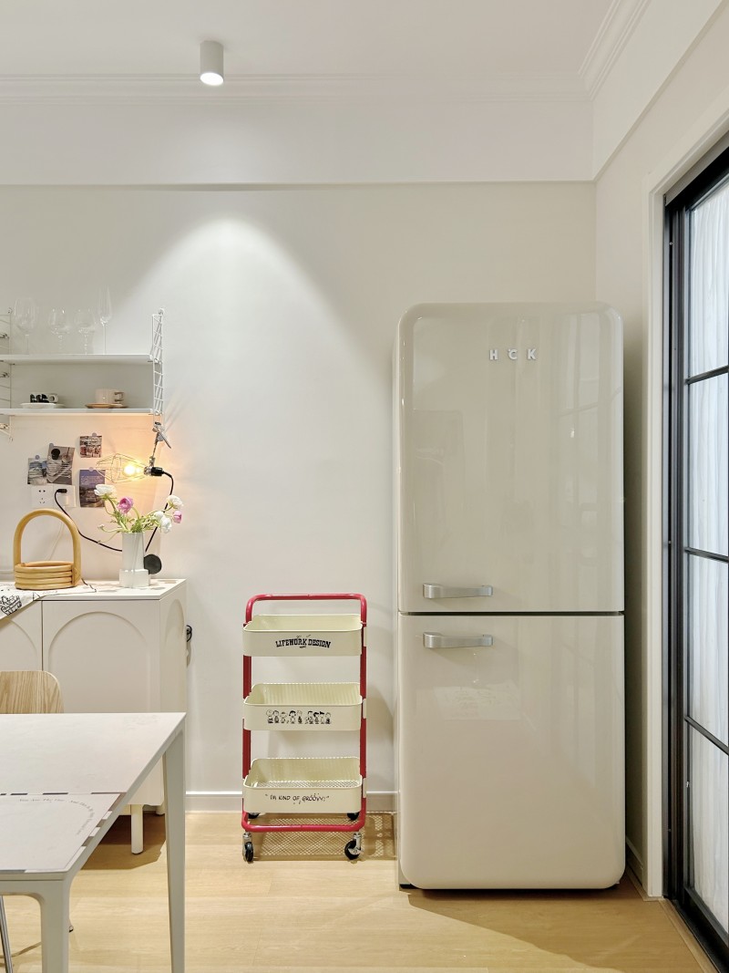 HCK哈士奇MAX双门复古冰箱颠覆传统双开门产品的笨重印象,以60cm超薄机身轻松融入家居氛围,流畅的圆弧线条搭配哑光奶油白漆面,还原复古经典美学;金属复古旋钮与隐藏式显示屏的设计,则注入现代简约气质。无论是北欧风厨房、日式原木餐厅,还是工业感loft空间,它都能成为视觉焦点。